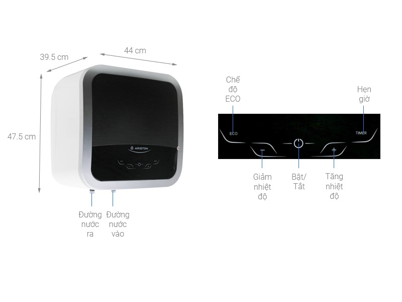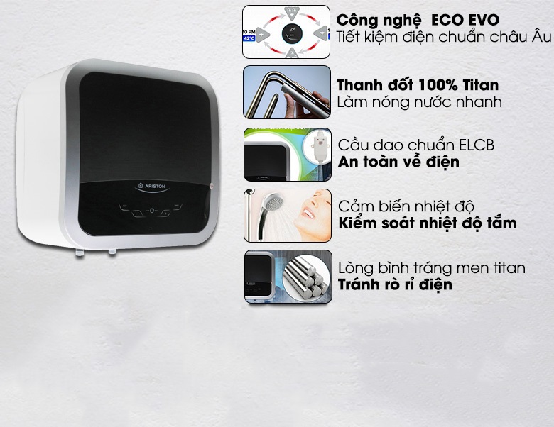 | Tiện ích: | Điều khiển qua app Aqua Ariston Net, Eco-Evo tiết kiệm điện, ion bạc kháng khuẩn, màn hình hiển thị nhiệt độ |