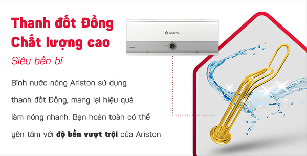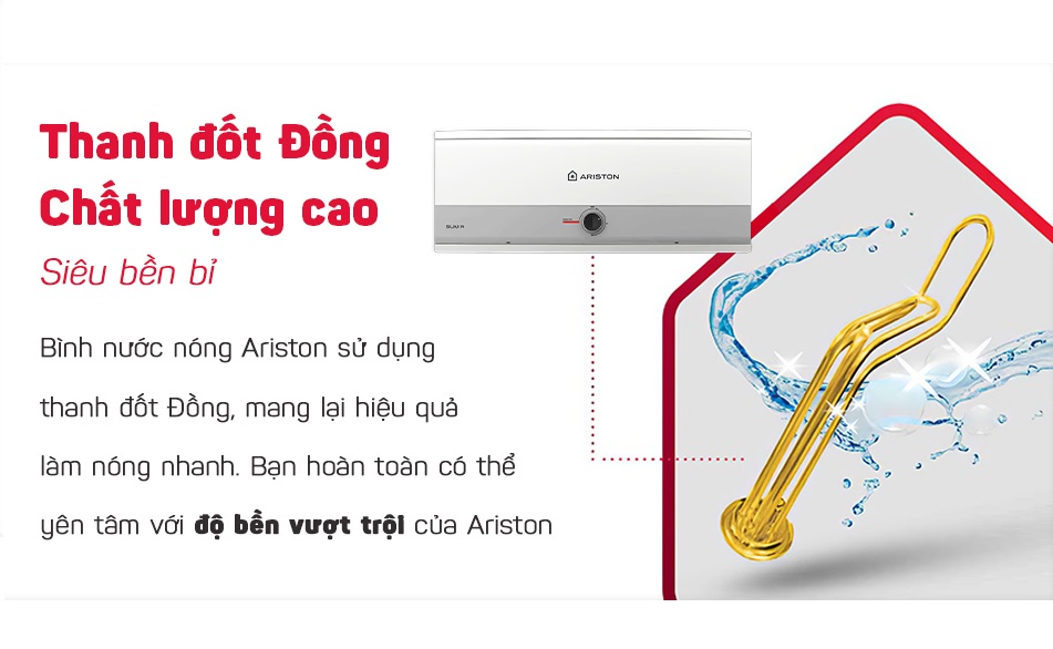 Thanh đốt 100% đồng: Đảm bảo khả năng làm nóng nhanh, kéo dài tuổi thọ của bình, chống ăn mòn và giữ nước luôn sạch sẽ.