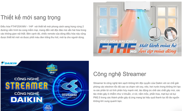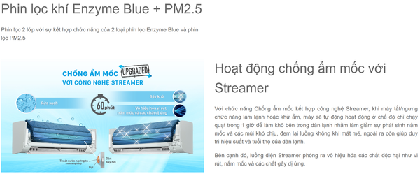 - Phin lọc Enzyme Blue, công nghệ Streamer độc quyền Daikin và phin lọc PM2.5 (tùy chọn) giúp lọc bụi mịn